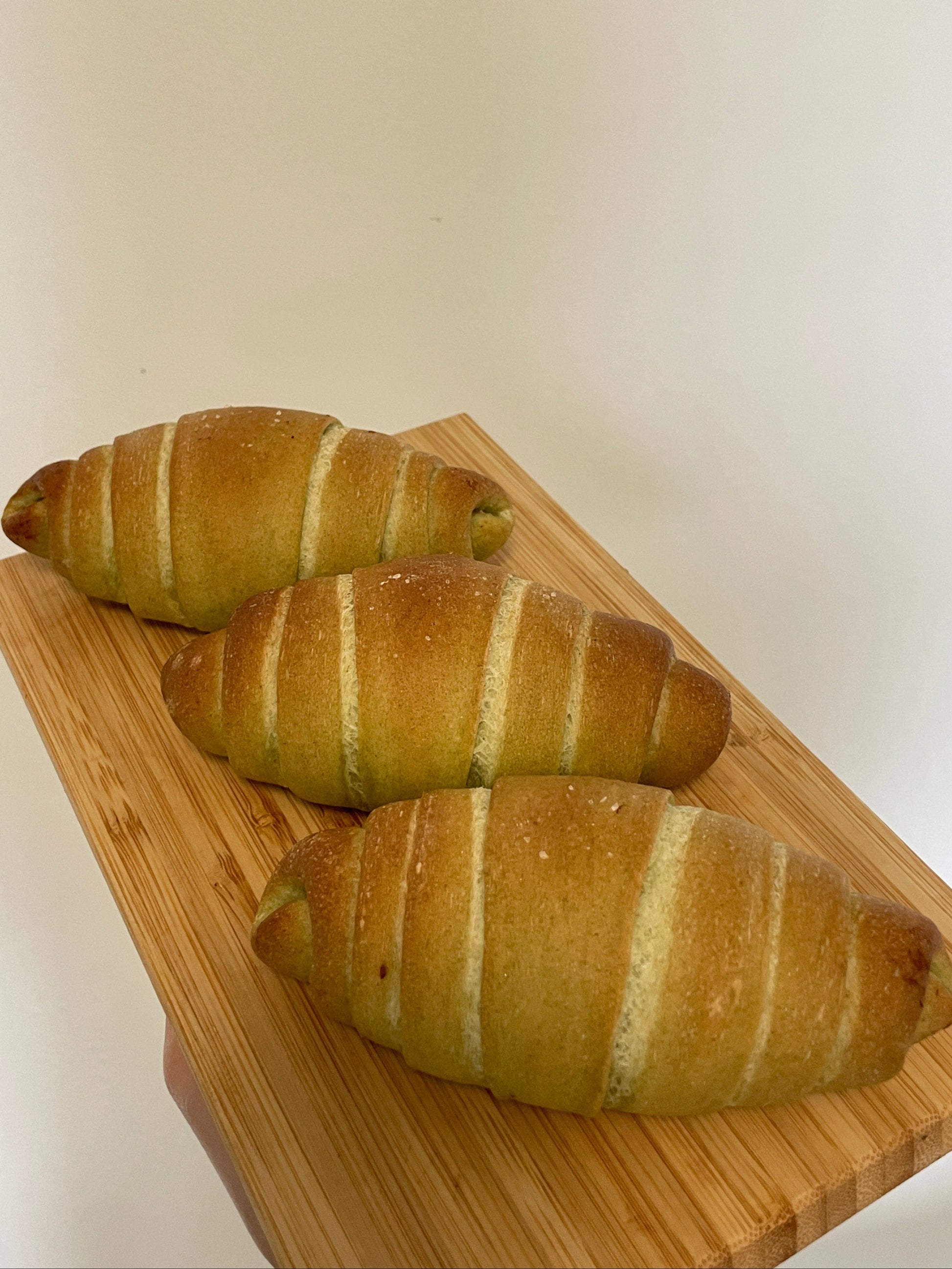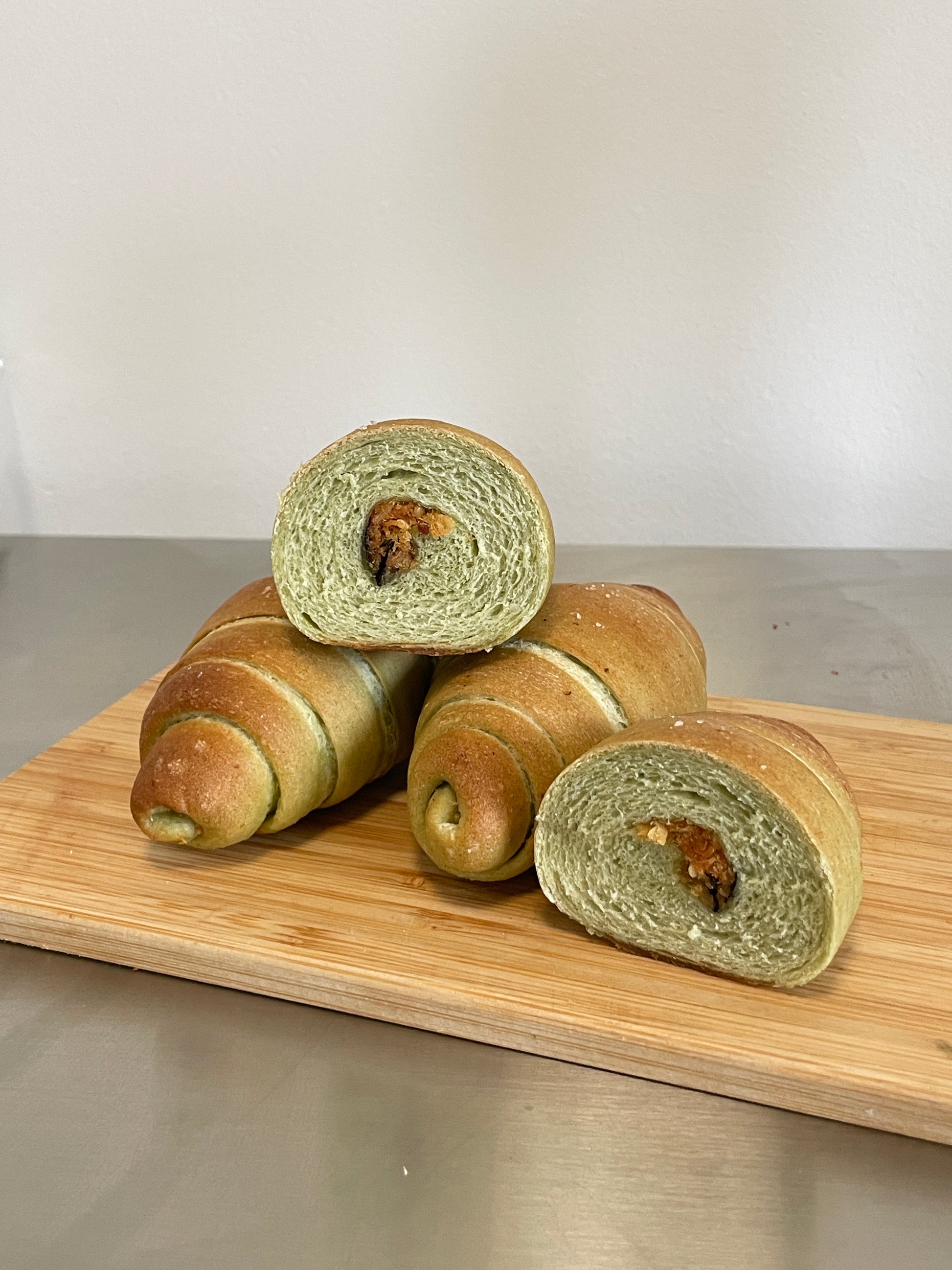 Soft dough infused with seaweed powder, rolled with a savory filling of butter and seaweed pork floss. Baked to bring out the rich umami and the toasty aroma of roasted seaweed — a deeply satisfying bite for those who love salty and umami-packed flavors.